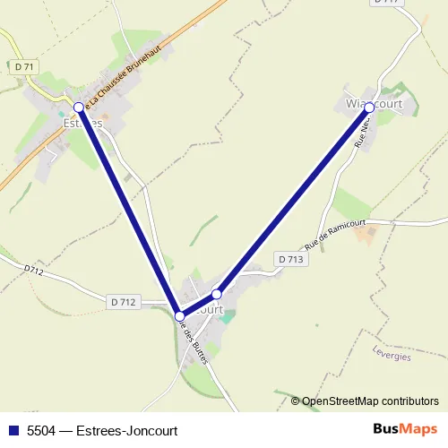 The first stop of the 5504 bus route is Joncourt - Wiancourt and the last stop is Estrees - Place Eglise. 5504 (Estrees-Joncourt) is operational during everyday.