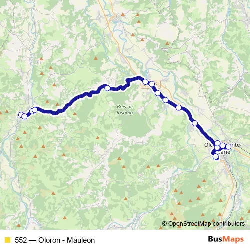 The first stop of the 552 bus route is Mauleon Soule - Gare and the last stop is Oloron - Notre Dame. 552 (Oloron - Mauleon) is operational during on weekdays.