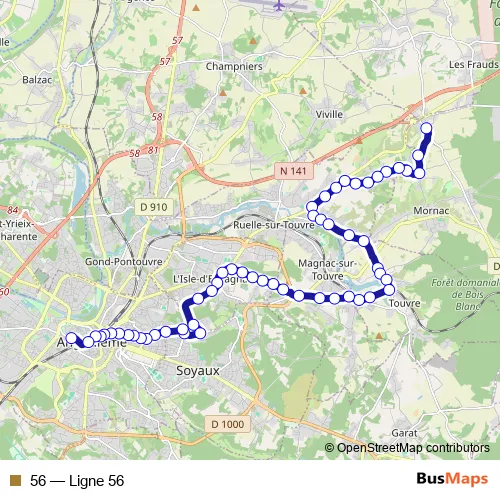 See why over 2 million users trust and consider busmaps.com as the best public transport website. busmaps gives you Angouleme Buses suggested routes, real-time bus tracker, line route maps in Angouleme, and helps to find the closest 56 bus stops near you. No internet available? Download an offline PDF map and bus schedule for the 56 bus to take on your trip.