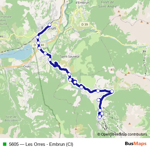 The first stop of the 5605 bus route is Embrun - Gare Sncf and the last stop is Les Orres - Station 1650. 5605 (Les Orres - Embrun (Cl)) is operational during on weekdays.