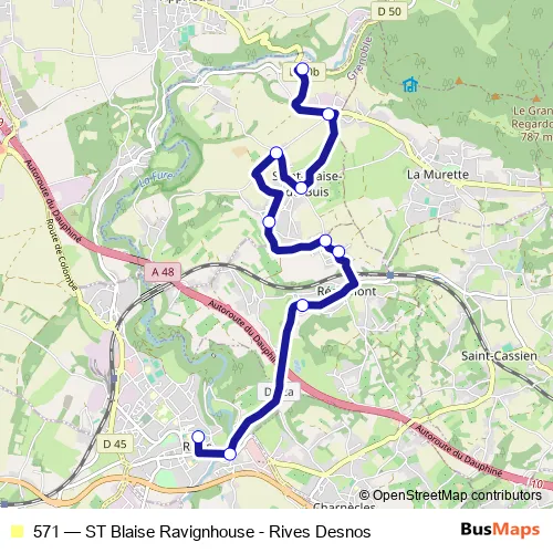 The first stop of the 571 bus route is Rives, College R Desnos and the last stop is Saint-Blaise-du-Buis, Ravignhouse. 571 (ST Blaise Ravignhouse - Rives Desnos) is operational during on weekdays.
