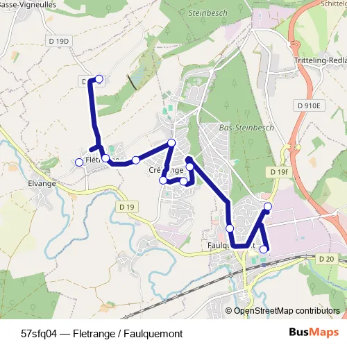 The first stop of the 57sfq04 bus route is Faulquemont - Lp Case and the last stop is Fletrange - Centre. 57sfq04 (Fletrange / Faulquemont) is operational during on weekdays.