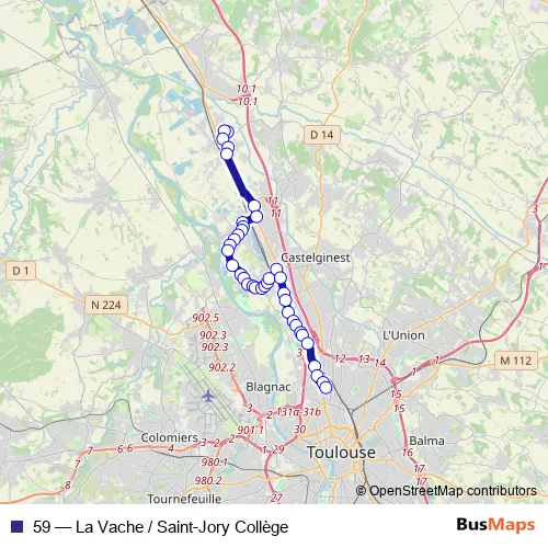 The first stop of the 59 bus route is Saint-Jory Collège and the last stop is La Vache. 59 (La Vache / Saint-Jory Collège) is operational during everyday.