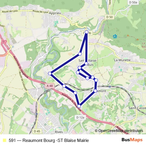 The first stop of the 591 bus route is Saint-Blaise-du-Buis, Mairie and the last stop is Réaumont, Bourg Ecole. 591 (Reaumont Bourg -ST Blaise Mairie) is operational during everyday.