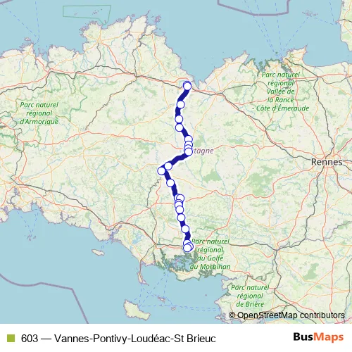 The first stop of the 603 bus route is Gare Sncf and the last stop is Place de la Libération. 603 (Vannes-Pontivy-Loudéac-St Brieuc) is operational during everyday.