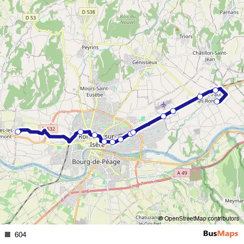 See why over 2 million users trust and consider busmaps.com as the best public transport website. busmaps gives you Romans-sur-Isere Buses suggested routes, real-time bus tracker, line route maps in Romans-sur-Isere, and helps to find the closest 604 bus stops near you. No internet available? Download an offline PDF map and bus schedule for the 604 bus to take on your trip.
