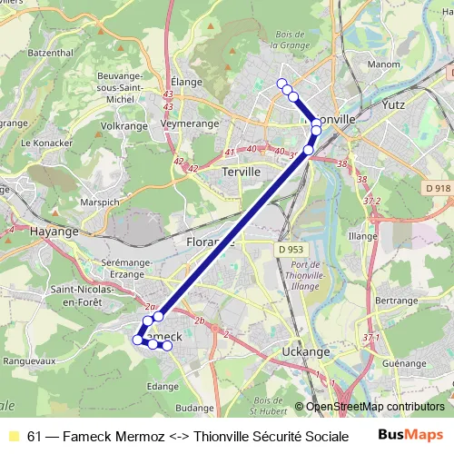 The first stop of the 61 bus route is Sécurité Sociale and the last stop is Mermoz. 61 (Fameck Mermoz <-> Thionville Sécurité Sociale) is operational during on weekdays.
