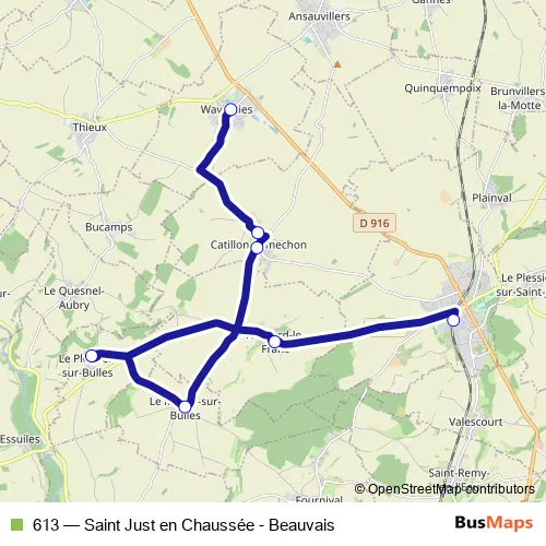 The first stop of the 613 bus route is Saint-Just-EN-Chaussee - Gare and the last stop is Wavignies - Eglise. 613 (Saint Just en Chaussée - Beauvais) is operational during everyday.