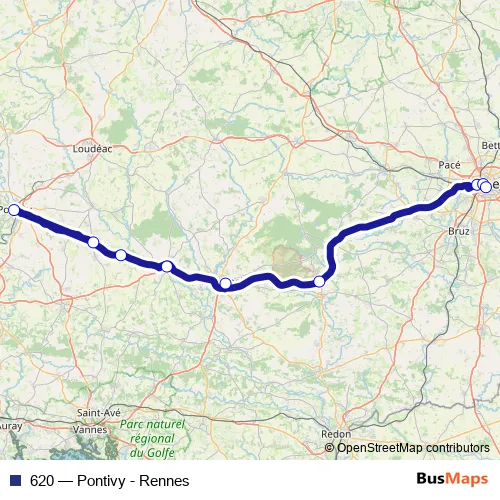 The first stop of the 620 bus route is Gare Sncf and the last stop is Gare Routière. 620 (Pontivy - Rennes) is operational during everyday.