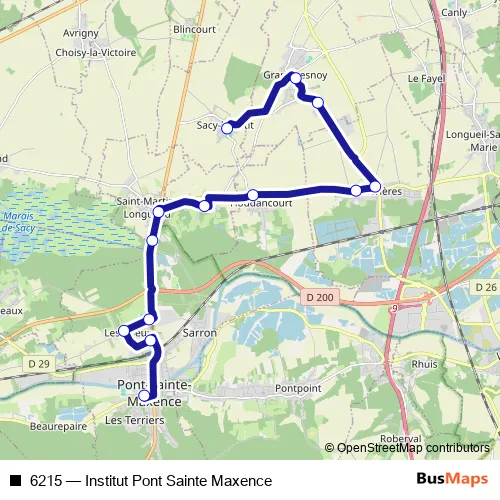The first stop of the 6215 bus route is Pont Sainte Maxence - Bibliothèque and the last stop is Sacy LE Petit - Place. 6215 (Institut Pont Sainte Maxence) is operational during on weekdays.
