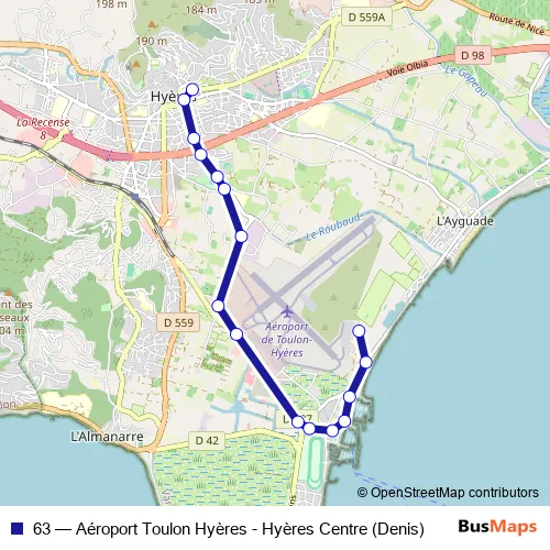 Bus 63 - Aéroport Toulon Hyères - Hyères Centre (Denis) in Toulon: Stops & Timetable