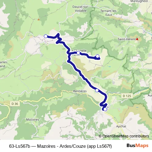 The first stop of the 63-Ls567b bus route is Rue des Ecoles and the last stop is Genelières. 63-Ls567b (Mazoires - Ardes/Couze (app Ls567f)) is operational during on weekdays.