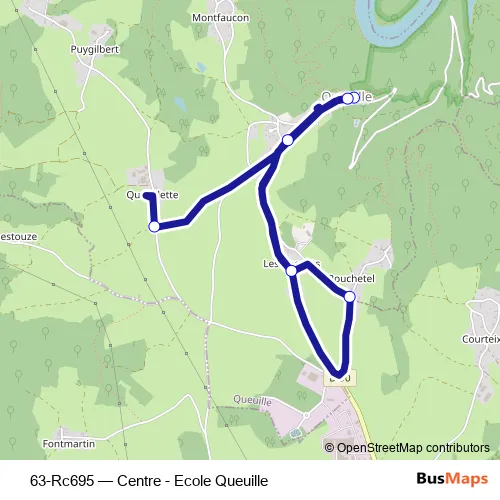 The first stop of the 63-Rc695 bus route is Eglise and the last stop is Ecole Queuille. 63-Rc695 (Centre - Ecole Queuille) is operational during everyday.