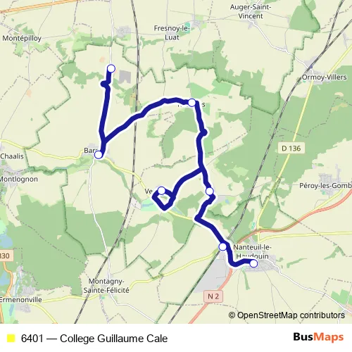 The first stop of the 6401 bus route is Nanteuil-LE-Haudouin - Collège Guillaume Cale and the last stop is Baron - Beaulieu. 6401 (College Guillaume Cale) is operational during on weekdays.