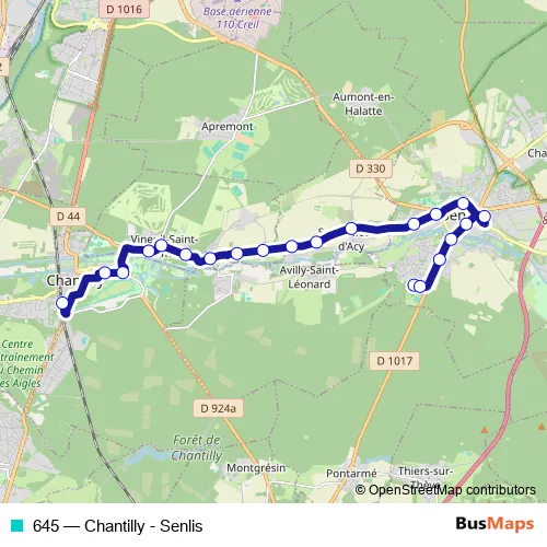 The first stop of the 645 bus route is Chantilly - Gare and the last stop is Senlis - Lycée Amyot d'Inville. 645 (Chantilly - Senlis) is operational during everyday.