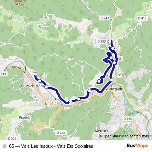 See why over 2 million users trust and consider busmaps.com as the best public transport website. busmaps gives you Vals-les-Bains Buses suggested routes, real-time bus tracker, line route maps in Vals-les-Bains, and helps to find the closest 65 bus stops near you. No internet available? Download an offline PDF map and bus schedule for the 65 bus to take on your trip.