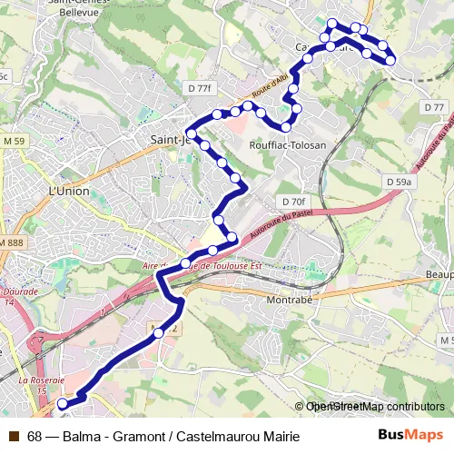 The first stop of the 68 bus route is Balma-Gramont and the last stop is Castelmaurou Mairie. 68 (Balma - Gramont / Castelmaurou Mairie) is operational during everyday.