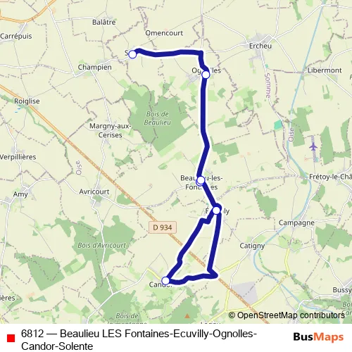 The first stop of the 6812 bus route is Ognolles - Centre and the last stop is Solente - Centre. 6812 (Beaulieu LES Fontaines-Ecuvilly-Ognolles-Candor-Solente) is operational during everyday.