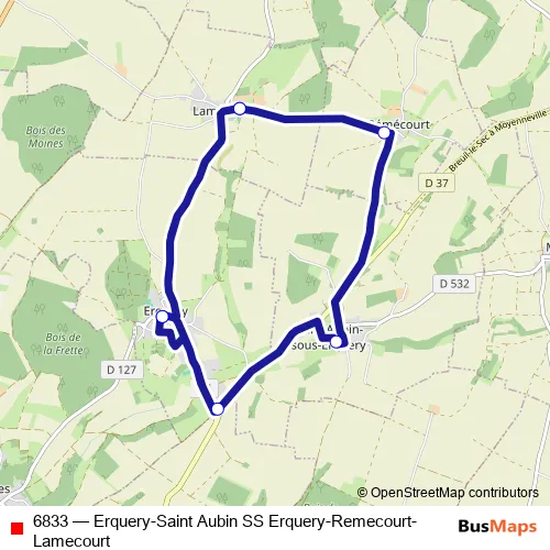 The first stop of the 6833 bus route is Lamecourt - Grande Rue and the last stop is Erquery - La sapinière. 6833 (Erquery-Saint Aubin SS Erquery-Remecourt-Lamecourt) is operational during everyday.
