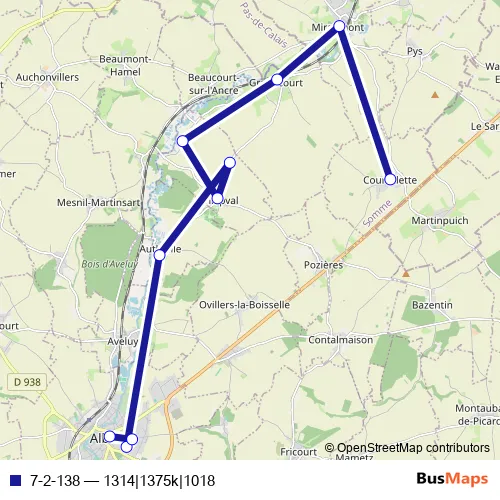 The first stop of the 7-2-138 bus route is Courcelette - Centre and the last stop is Albert - Collège Pierre et Marie Curie. 7-2-138 (1314|1375k|1018) is operational during everyday.