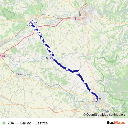 The first stop of the 704 bus route is Gaillac - Gare Routière and the last stop is Castres - Gare Routière. 704 (Gaillac - Castres) is operational during everyday.