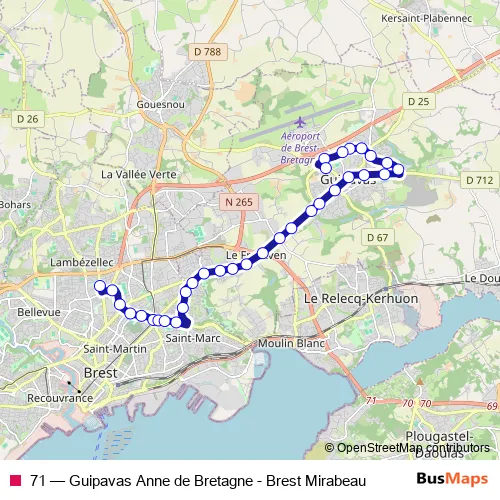 The first stop of the 71 bus route is Mirabeau and the last stop is Anne de Bretagne. 71 (Guipavas Anne de Bretagne - Brest Mirabeau) is operational during on weekdays.
