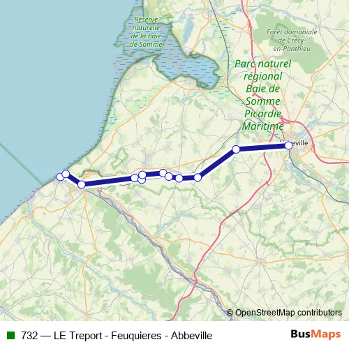 The first stop of the 732 bus route is LE Treport - Gare Sncf and the last stop is Abbeville - Gare Sncf. 732 (LE Treport - Feuquieres - Abbeville) is operational during everyday.