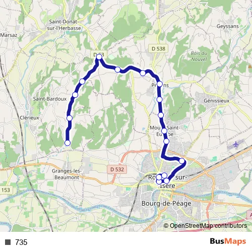 The first stop of the 735 bus route is ST Bardoux LES Buis and the last stop is Romans Gare. 735 is operational during on weekdays.
