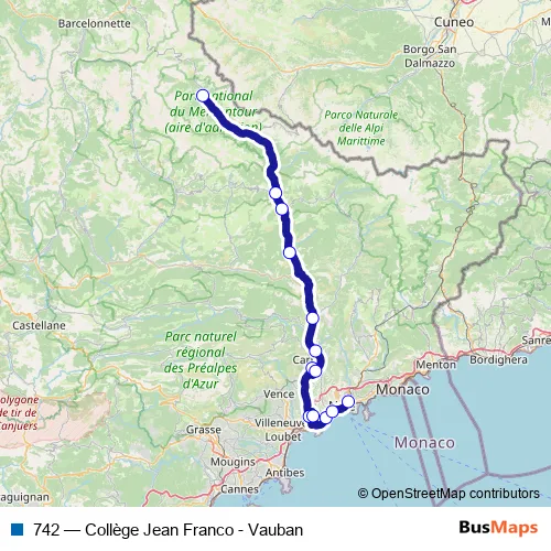 The first stop of the 742 bus route is Collège Jean Franco and the last stop is Vauban. 742 (Collège Jean Franco - Vauban) is operational during everyday.