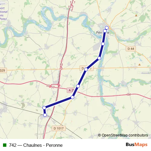 The first stop of the 742 bus route is Chaulnes - Regroupement Gare and the last stop is Peronne - Cité Scolaire. 742 (Chaulnes - Peronne) is operational during everyday.