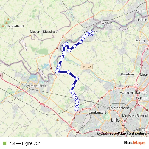 The first stop of the 75r bus route is Comines Gare and the last stop is St. Philibert. 75r (Ligne 75r) is operational during everyday.