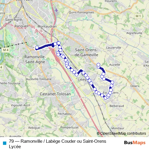 The first stop of the 79 bus route is Ramonville and the last stop is St-Orens Lycée. 79 (Ramonville / Labège Couder ou Saint-Orens Lycée) is operational during everyday.