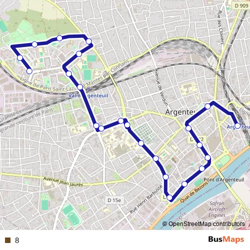 The first stop of the 8 bus route is Gare d'Argenteuil and the last stop is Bérionne. 8 is operational during everyday.