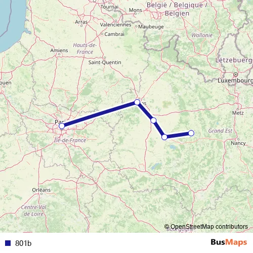 The first stop of the 801b rail route is Paris-Est and the last stop is Bar-le-Duc. 801b is operational during everyday.