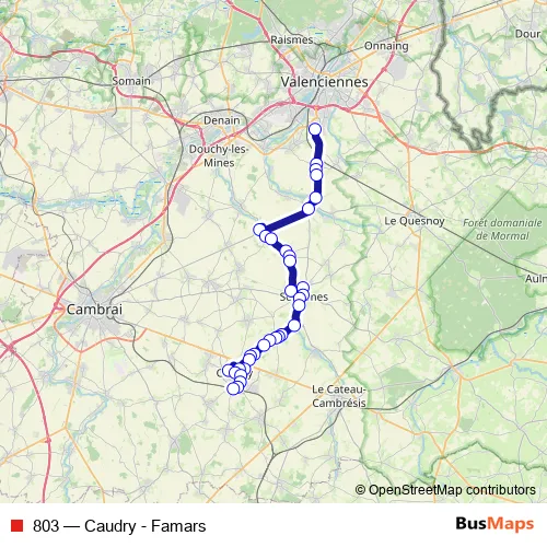 The first stop of the 803 bus route is Famars - Université and the last stop is Caudry - Gare. 803 (Caudry - Famars) is operational during everyday.
