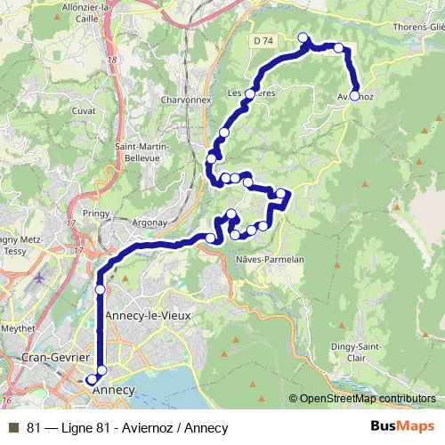 The first stop of the 81 bus route is Aviernoz Chef Lieu and the last stop is Annecy Gare. 81 (Ligne 81 - Aviernoz / Annecy) is operational during on weekdays.