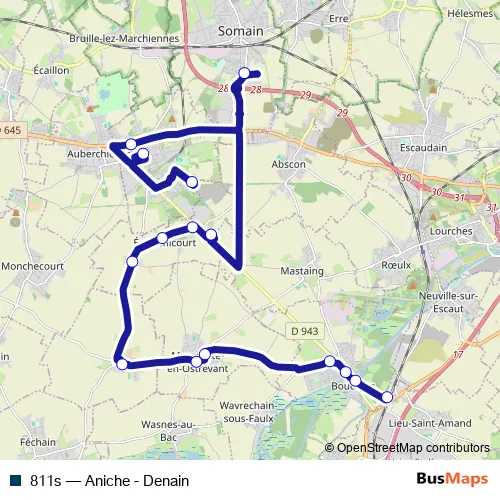 The first stop of the 811s bus route is Aniche - Azincourt and the last stop is Bouchain - Gare. 811s (Aniche - Denain) is operational during on weekdays.