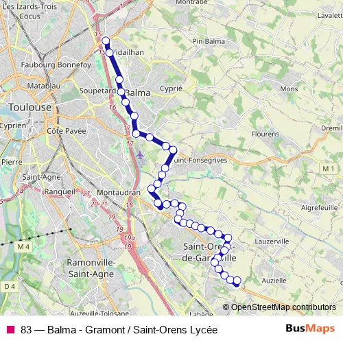The first stop of the 83 bus route is Balma-Gramont and the last stop is St-Orens Lycée. 83 (Balma - Gramont / Saint-Orens Lycée) is operational during everyday.