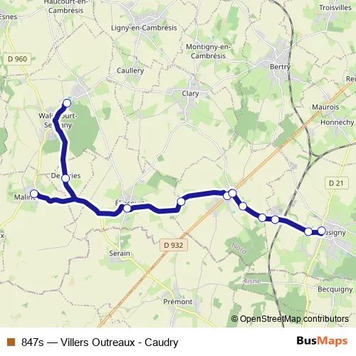 The first stop of the 847s bus route is Walincourt-Selvigny - Collège F. Villon and the last stop is Busigny - Bascule. 847s (Villers Outreaux - Caudry) is operational during on weekdays.
