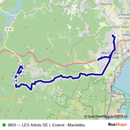 The first stop of the 8603 bus route is College Mimosas and the last stop is Logis de Paris. 8603 (LES Adrets DE L Esterel - Mandelieu) is operational during on weekdays.