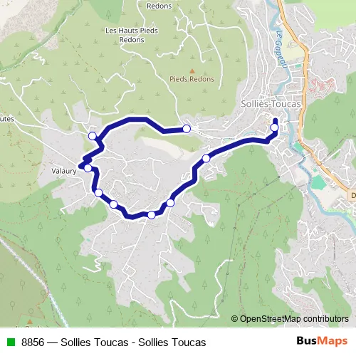 The first stop of the 8856 bus route is Les Pieds Redon and the last stop is Ecole Maternelle et Primaire. 8856 (Sollies Toucas - Sollies Toucas) is operational during everyday.