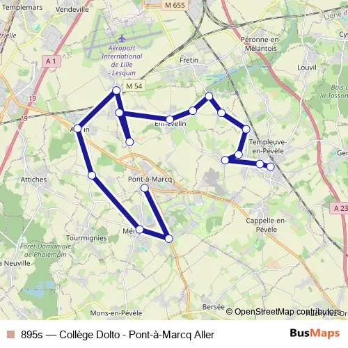 The first stop of the 895s bus route is Pont A Marcq - Collège Dolto and the last stop is Templeuve - Rue d'Ennevelin. 895s (Collège Dolto - Pont-à-Marcq Aller) is operational during on weekdays.