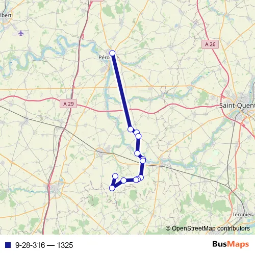 The first stop of the 9-28-316 bus route is Peronne - Lycée P. M. France and the last stop is Moyencourt - Jeu d'Arc. 9-28-316 (1325) is operational during on weekdays.
