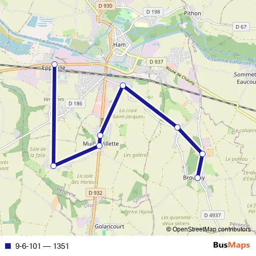 The first stop of the 9-6-101 bus route is Brouchy - Mairie and the last stop is Eppeville - Ecole élémentaire. 9-6-101 (1351) is operational during everyday.