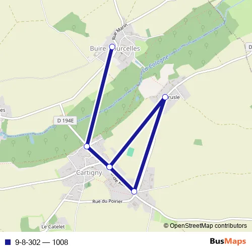 The first stop of the 9-8-302 bus route is Buire-Courcelles - Ecole and the last stop is Cartigny - Ecole maternelle. 9-8-302 (1008) is operational during everyday.
