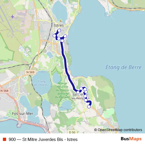 The first stop of the 900 bus route is Juverdes Bis and the last stop is Gare Istres. 900 (St Mitre Juverdes Bis - Istres) is operational during on weekdays.