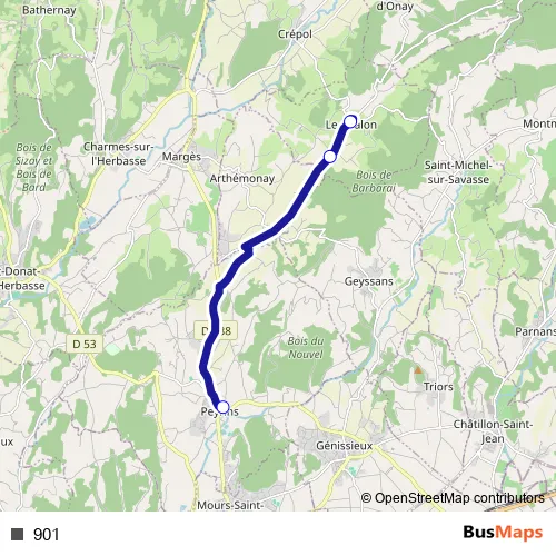 The first stop of the 901 bus route is Peyrins Ecoles and the last stop is Ferme Comte. 901 is operational during everyday.