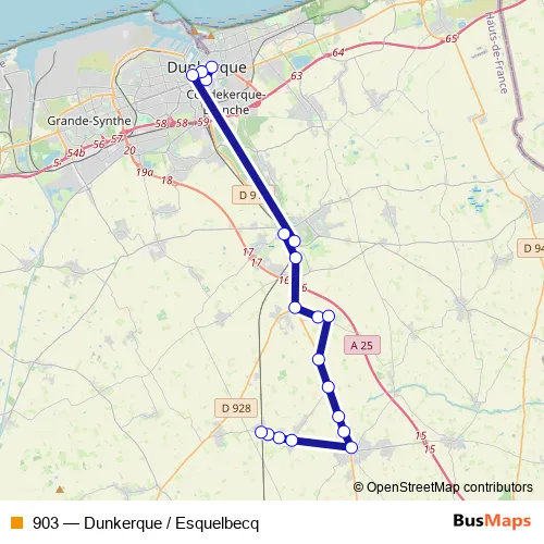 The first stop of the 903 bus route is Dunkerque - Place Vauban and the last stop is Esquelbecq - Gare. 903 (Dunkerque / Esquelbecq) is operational during everyday.