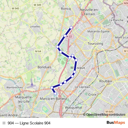See why over 2 million users trust and consider busmaps.com as the best public transport website. busmaps gives you Lille Buses suggested routes, real-time bus tracker, line route maps in Lille, and helps to find the closest 904 bus stops near you. No internet available? Download an offline PDF map and bus schedule for the 904 bus to take on your trip.