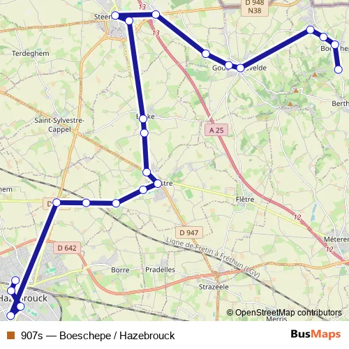 The first stop of the 907s bus route is Hazebrouck - Lycée des Flandres and the last stop is Boeschepe - Plateau de Boeschepe. 907s (Boeschepe / Hazebrouck) is operational during on weekdays.